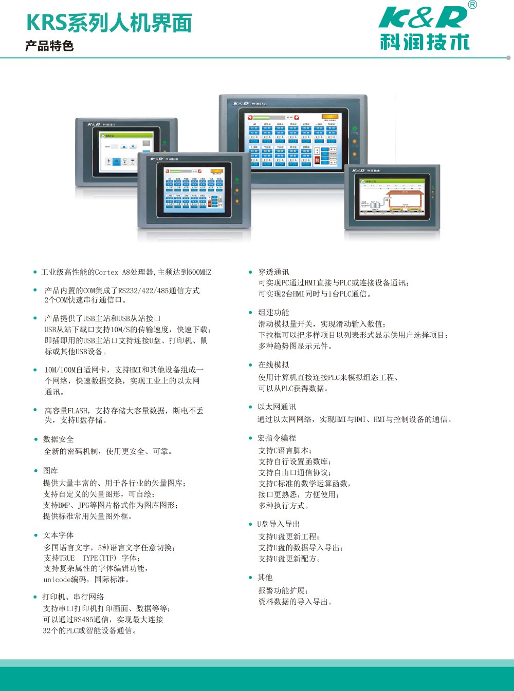 科润HMI显示丰富、内存庞大、组态功能强大、使用简单的人机界面,可轻松实现工业自动化各领域的人机交互功能。与科润技术的PLC、变频器等产品一同构成系统时,将更容易设置及操作。
